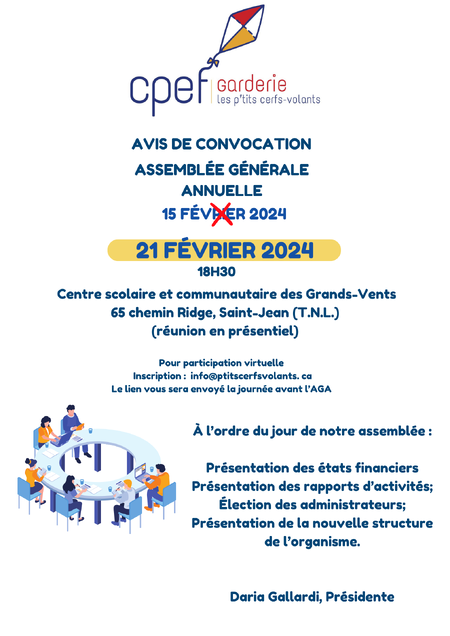 En raison des conditions météorologiques imprévues, nous sommes contraints de reporter notre Assemblée Générale Annuelle à une date ultérieure pour garantir la sécurité et le bien-être de tous nos participants.